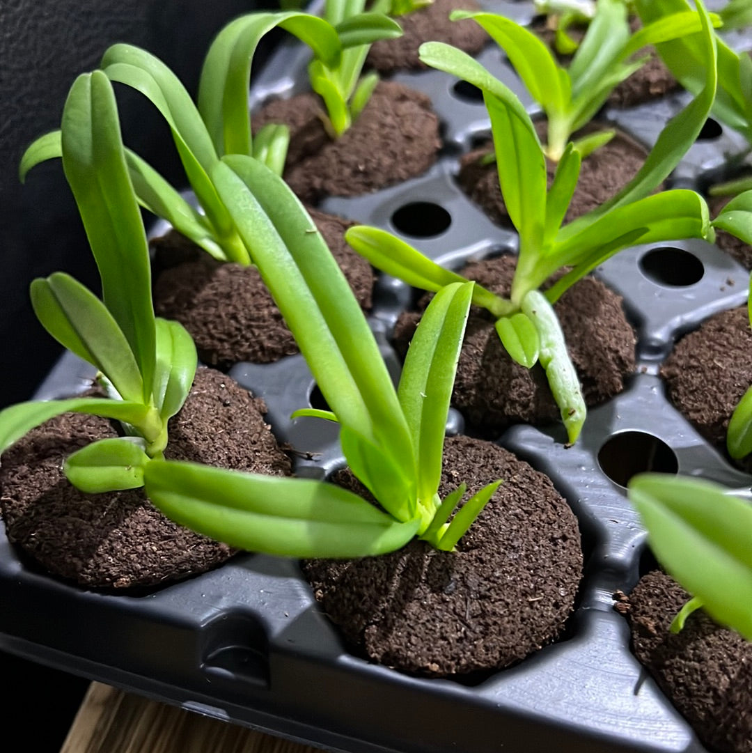 | Repotting | It is encouraged that you repot orchids only when the plant is outgrowing the pot. An orchid needs to be repotted when roots start growing outside of the pot vigorously and the pot swells or cracks. Only use a pot that is one size larger than the previous pot. Do not repot seedlings immediately upon receiving them as this can slow down growth and may cause transplant shock. When repotting, choose a pot with drainage holes so that water does not pool and cause root rot. |