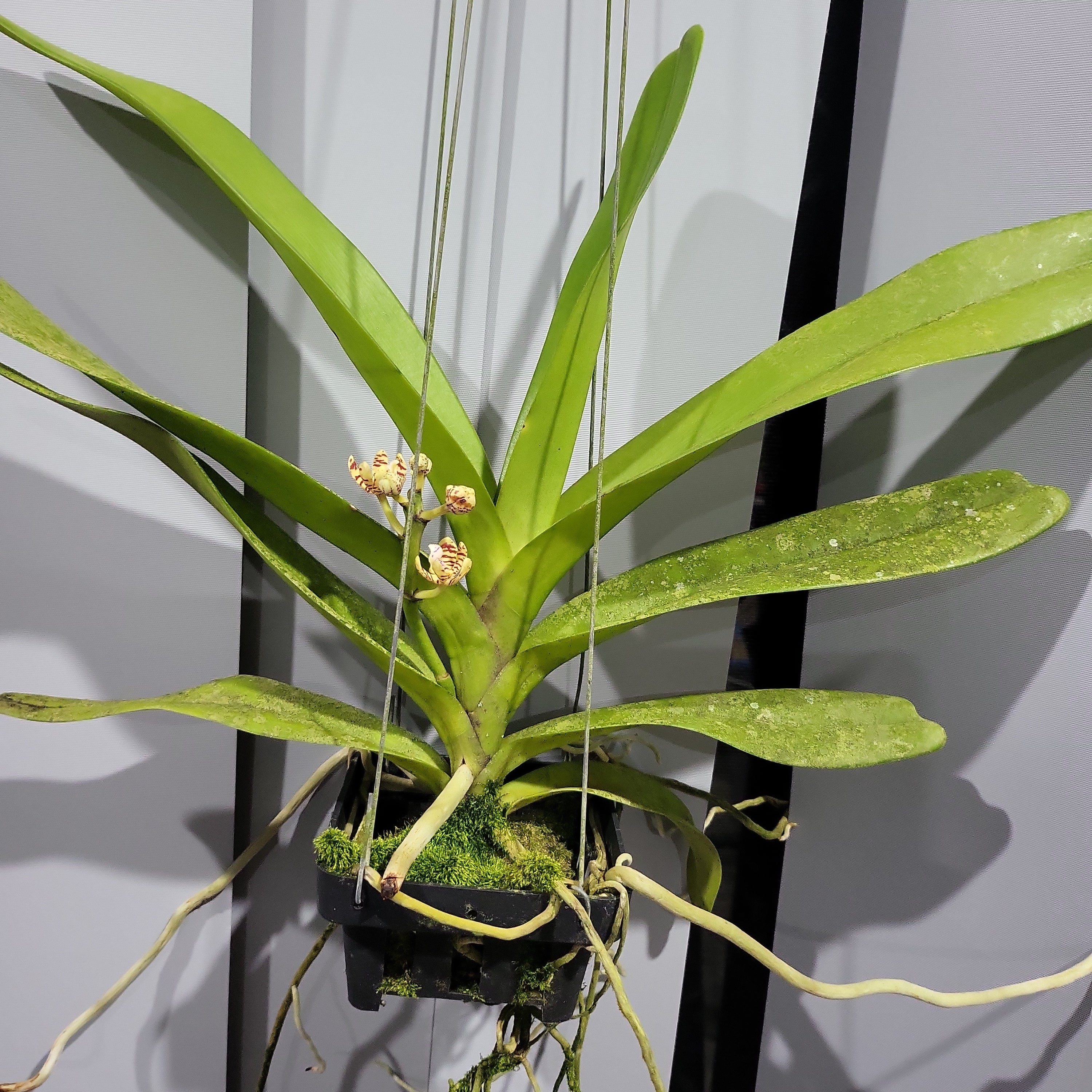 Aerides rigida is a robust species with an unbranched stem up to 1 m (40 in) in length and 20 mm (0.8 in) in diameter. The leaves are disticious. The stem nodes are about 25 mm (1 in) apart and each bears a somewhat fleshy, upright leaf with sheathing base. The apices of the leaves are obtuse and unequally bilobed. The inflorescence is unbranched or sparsely branched, with many slightly fragrant, upturned, cup-shaped flowers less than 25 mm (1 in) in diameter. The petals are fleshy, and are yellow with purplish-brown stripes; they have a thick, white, three-lobed lower lip, and a short spur. They are followed by cylindrical or fusiform capsules.