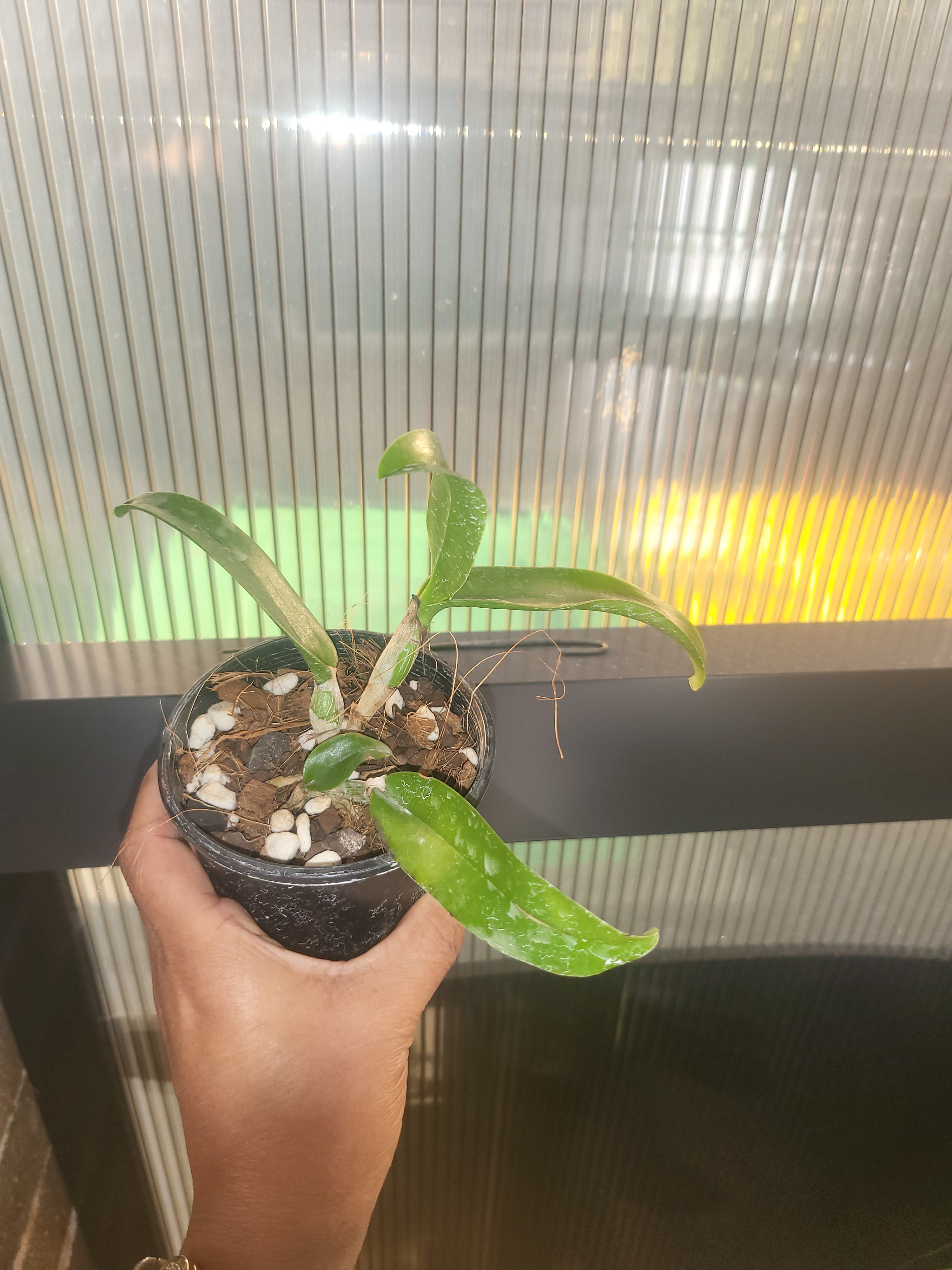 Cattleya Nell Hammer is a hybrid with fresh medium-sized yellow/white highly fragrant flowers. Lovely lemony-citracy fragrance! The yellow color comes from the parent Cat. Haadyai Delight. The inflorescence generally has 2-3 flowers in a bunch, an inheritance from the parent Cat. Varut Startrack. This variety is compact growing, remains short and develops nice fleshy psudobulbs. All plants have fresh new growths.