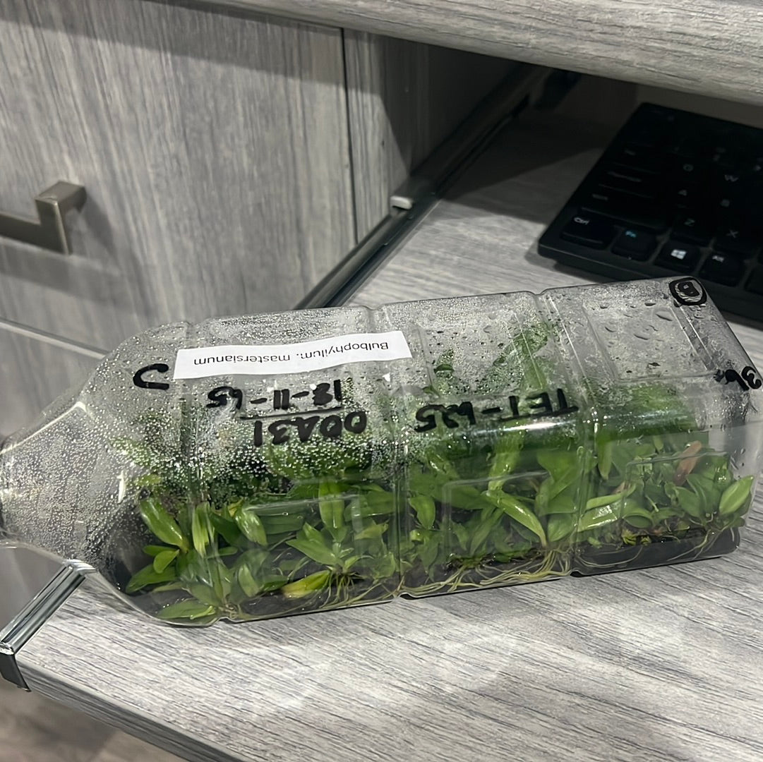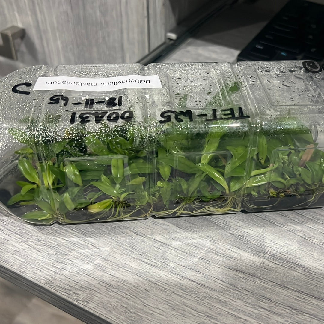Bulbophyllum mastersianum “Master’s Bulbophyllum” is a miniature epiphyte from Borno and Moluccas that grows intermediate to hot. The umbels of flowers are quite showy and range from yellow to salmon in color. Plants grow well in small baskets or net pots.