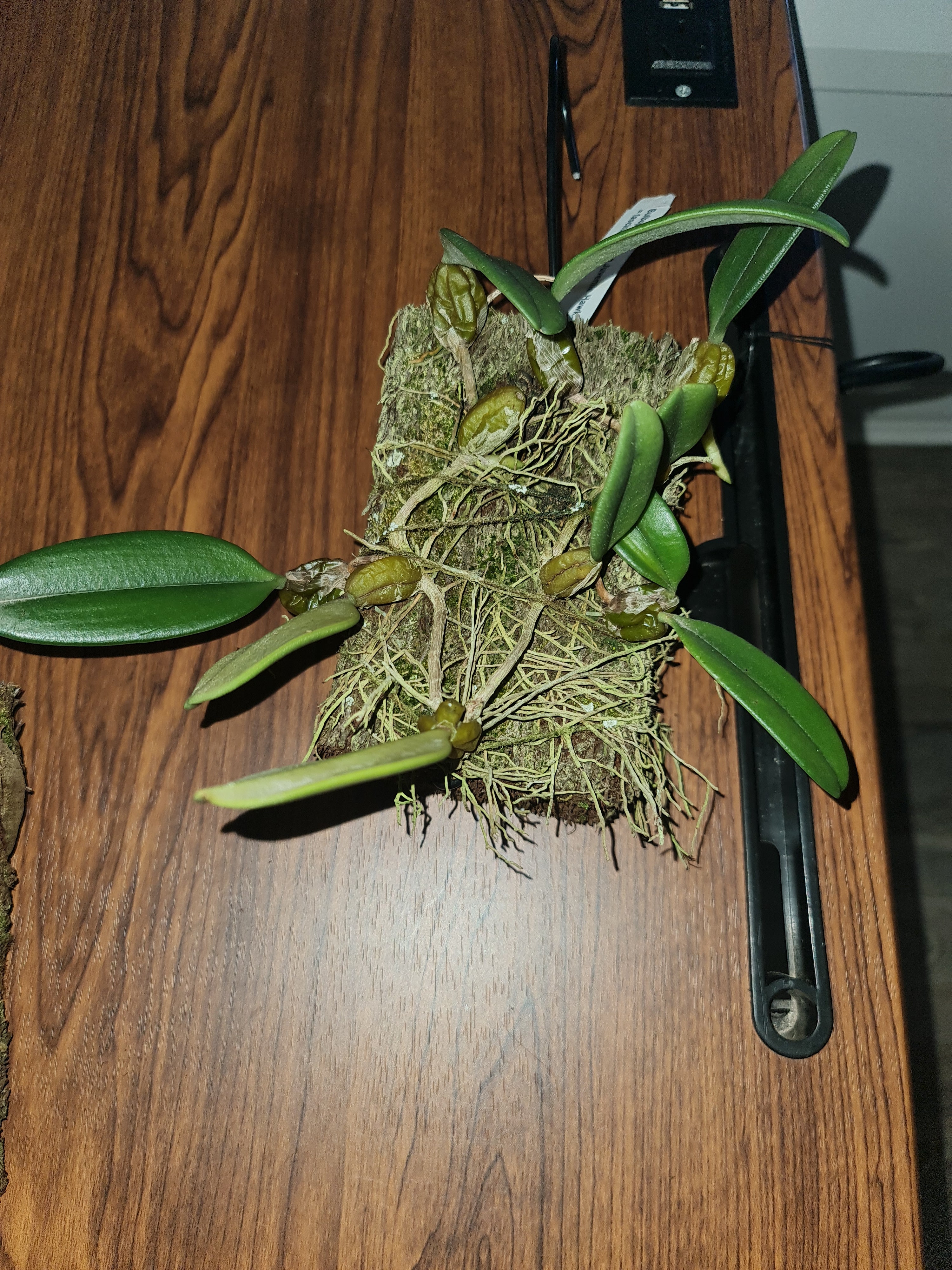 The orchid Bulbophyllum Meen Juvenile Hawk is a hybrid in the Bulbophyllum genus. registered with the Royal Horticultural Society by Meen Nursery in 2014. Registered parents are Bulbophyllum fascinator × Bulbophyllum frostii.