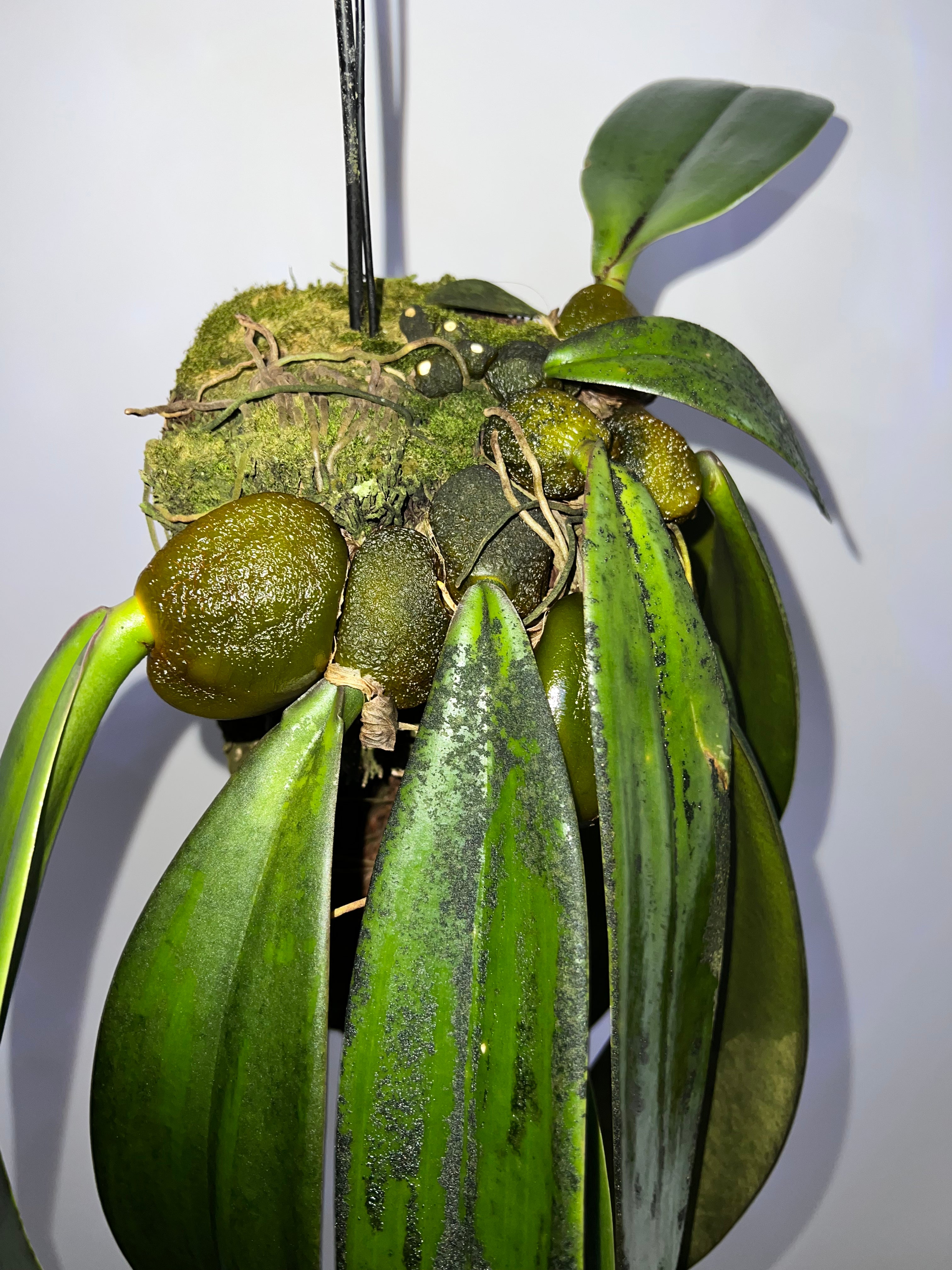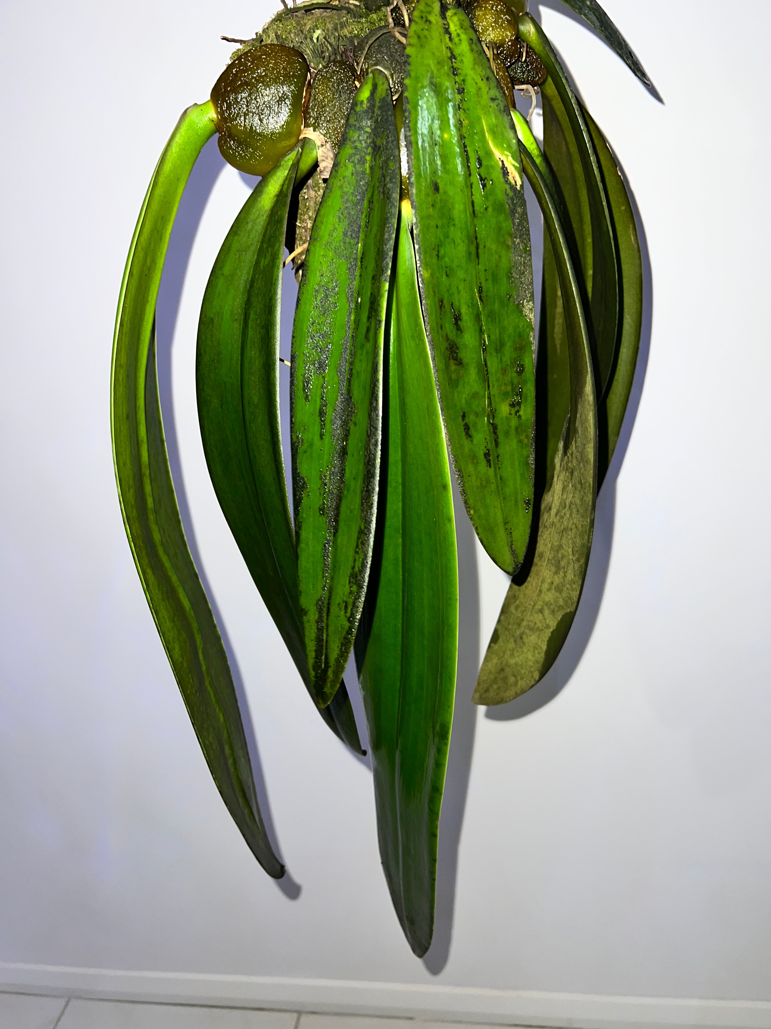 Bulbophyllum phalaenopsis is named not for floral similarities, but for the similarity in the leaves of the plant. This is a large sized, epiphytic species from New Guinea that is found at elevations below 500 meters and blooms on a basal, short, fasciculate inflorescence with the fetid smelling flowers clustered against the pseudobulb. A hot growing species that needs deep shade, good air circulation and high humidity to grow well.