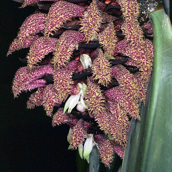 Bulbophyllum phalaenopsis is named not for floral similarities, but for the similarity in the leaves of the plant. This is a large sized, epiphytic species from New Guinea that is found at elevations below 500 meters and blooms on a basal, short, fasciculate inflorescence with the fetid smelling flowers clustered against the pseudobulb. A hot growing species that needs deep shade, good air circulation and high humidity to grow well.