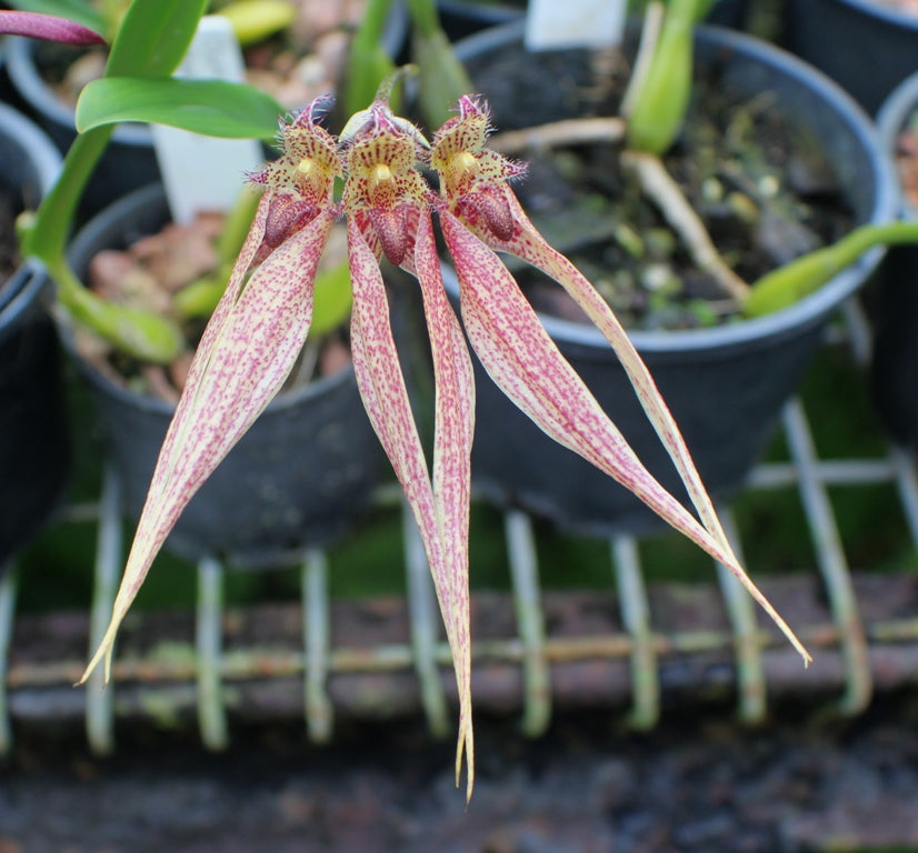 This is a beautiful cross between the Bulbophyllum Santa Claus and Annandalei. The flowers have beautiful red spots and a darker red lip, they are truly stunning. This plant is in multiple spikes. Please see photo for the flower.