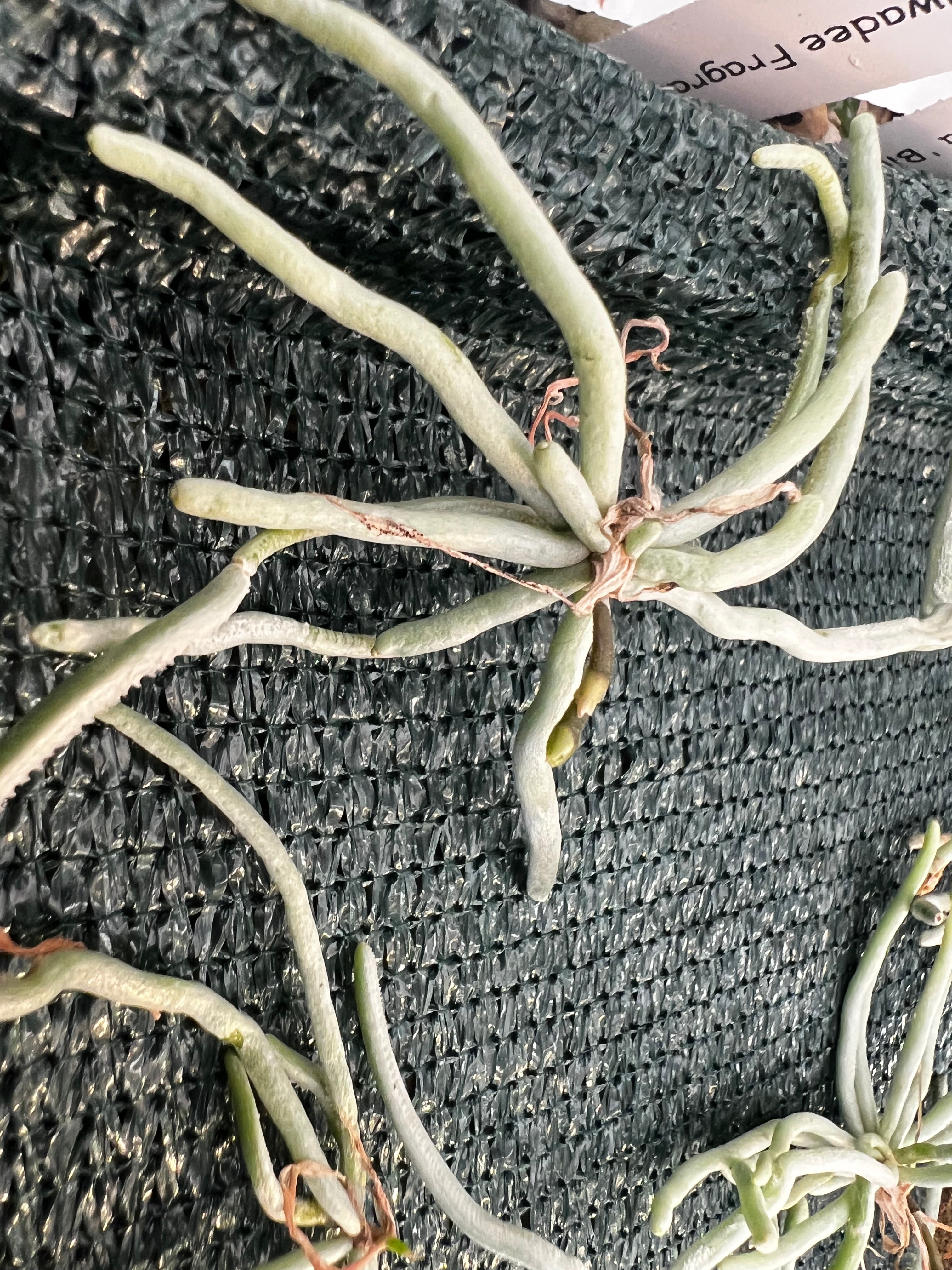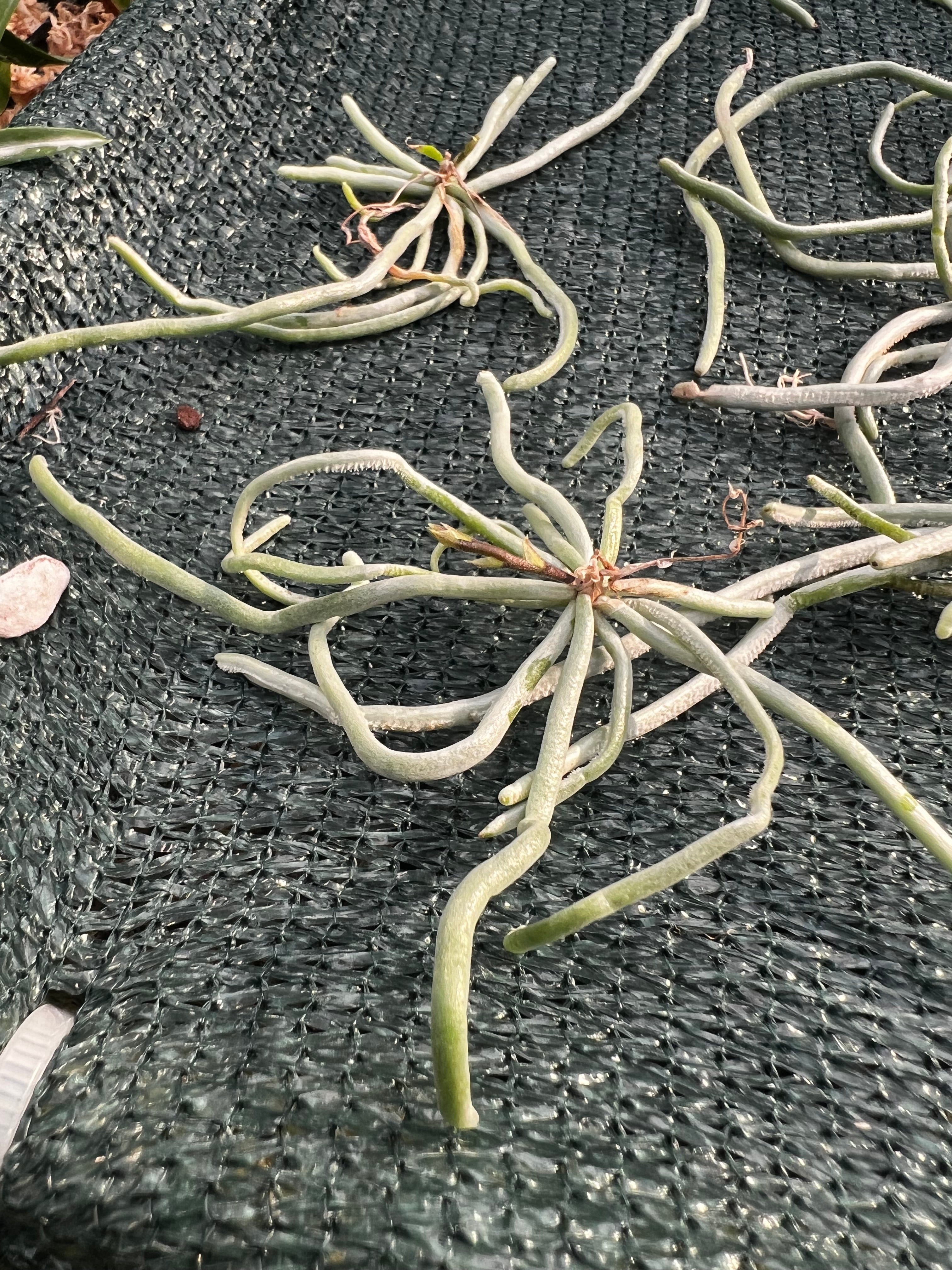 Discovered by missionary and plant explorer Charles Parish. This species is native to Southeast Asia and grows as an epiphyte on tree branches. The plants are basically leafless for much of the year but can develop a couple of small leaves during the summer months. The 1/4-3/8" flowers emerge on spikes that arise from the base of the root system. There can be quite an abundance of beautiful yellow flowers that are long-lasting. The flowers typically emerge in spring but can appear at different times if the conditions are correct. Grow in medium light and mist every one to three days. Fertilize with mist once every other week. Reminiscent of the famous ghost orchid but very easy to grow. Our plants are sometimes grown on folded layers of shade cloth which works well at retaining some moisture or they may be grown on cork slabs.