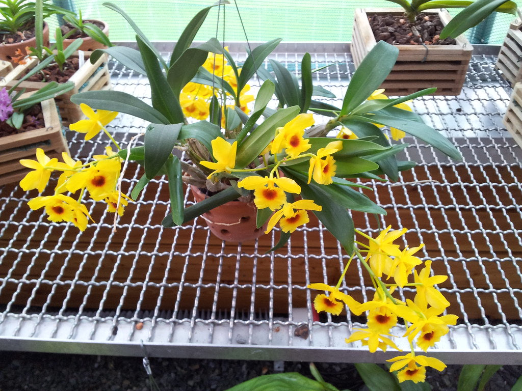 On offer a very healthy and fragrant orchid. Dendrobium Crysotoxum var Suavissimum is a small sized, cool to warm growing epiphyte native of Myanmar, Laos, Thailand, Vietnam, China, eastern Himalayas, Bangladesh and Assam India at elevations of 400 to 1600 meters.
