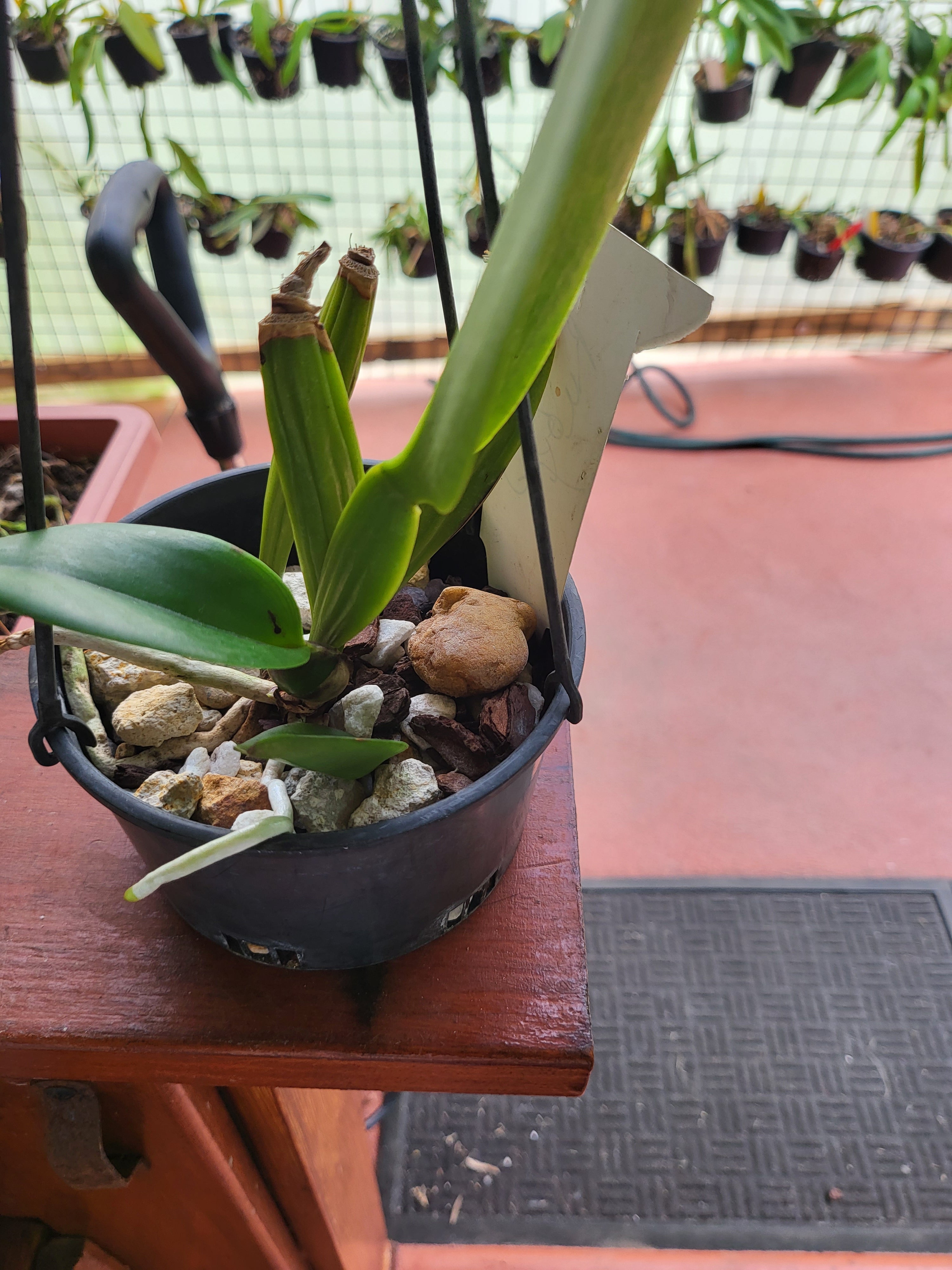 | Repotting | It is encouraged that you repot orchids only when the plant is outgrowing the pot. An orchid needs to be repotted when roots start growing outside of the pot vigorously and the pot swells or cracks. Only use a pot that is one size larger than the previous pot. Do not repot seedlings immediately upon receiving them as this can slow down growth and may cause transplant shock. When repotting, choose a pot with drainage holes so that water does not pool and cause root rot. |