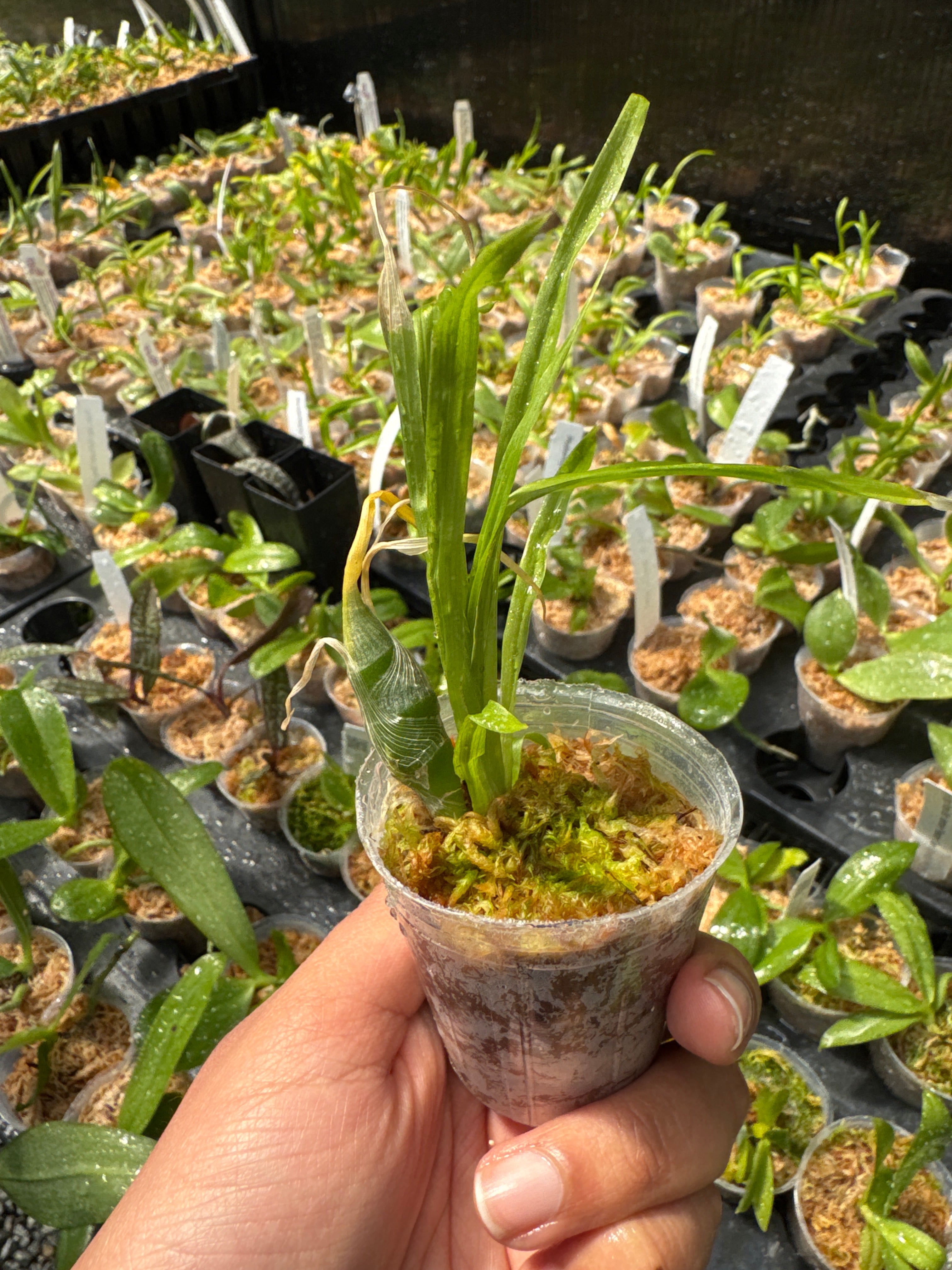 This is an award-winning Cycnodes. Be aware that this group of orchids are deciduous. Don't be surprised if you have a completely bald pseudobulb in winter. This is a normal part of the plants' growth cycle. The plants for sale are seedlings repotted in 50mm tubes.