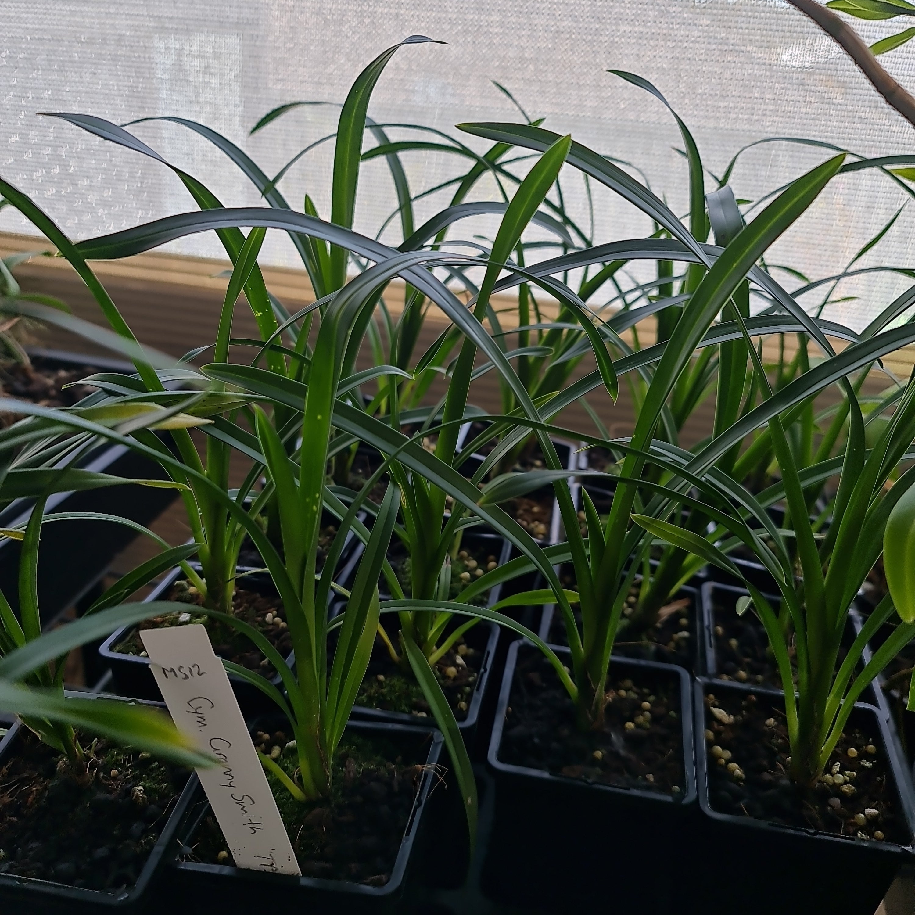 Cymbidium Granny Smith is an orchid hybrid originated by Hodgins in 1998. It is a cross of Cym. Borough Green x Cym. Wyanga.