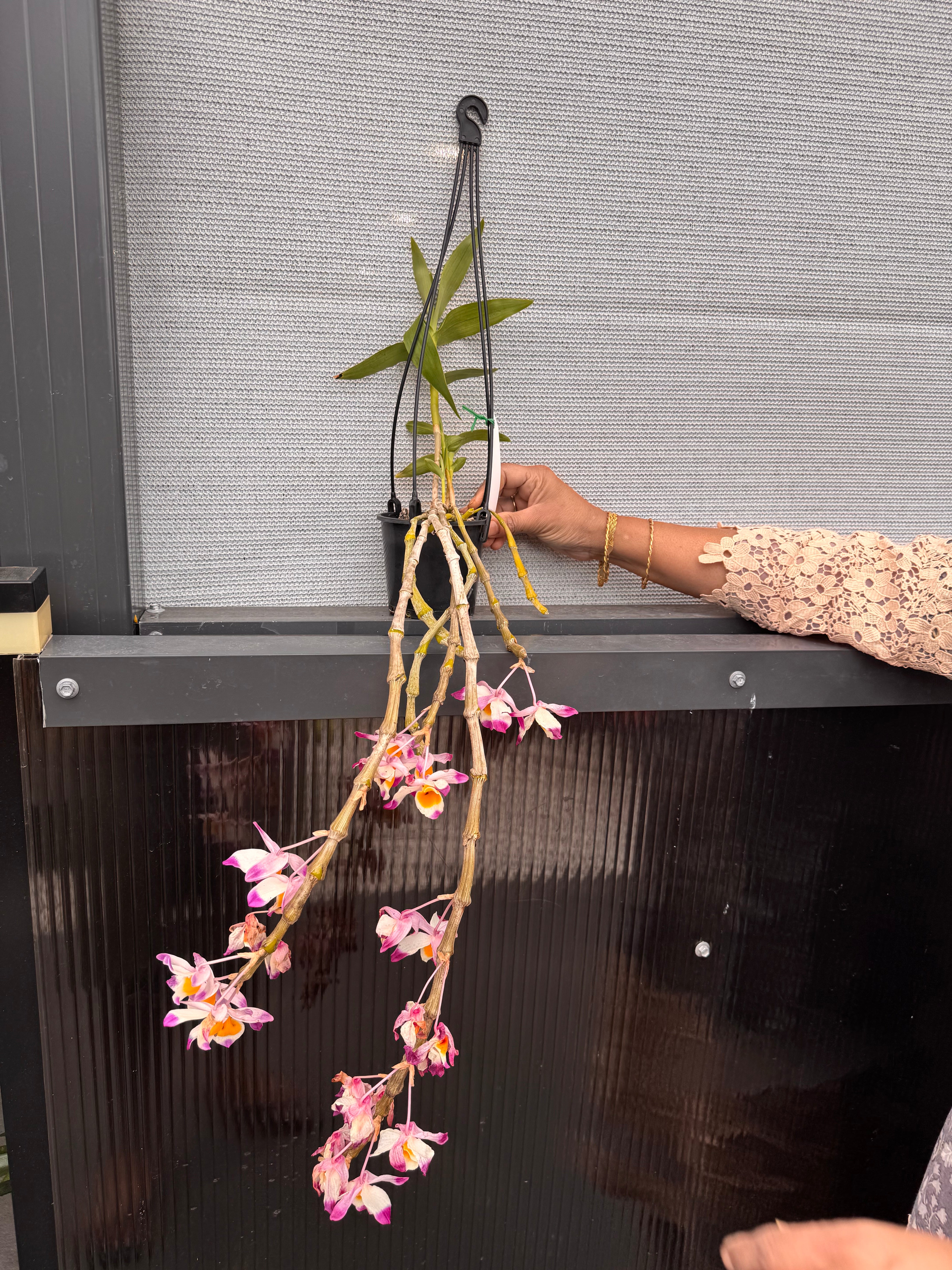 An easy to grow primary hybrids Dendrobium cross between pendulum 'Black Eyes' and wardianum. Plants for sale are well established, flowering size.