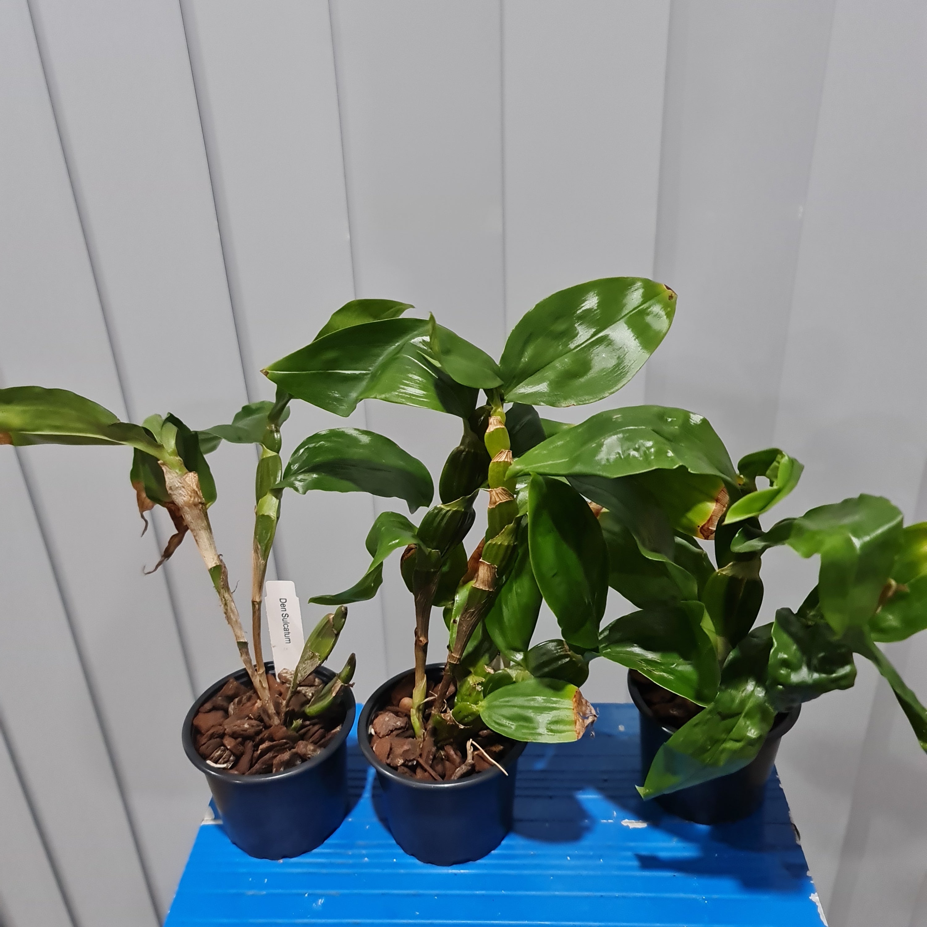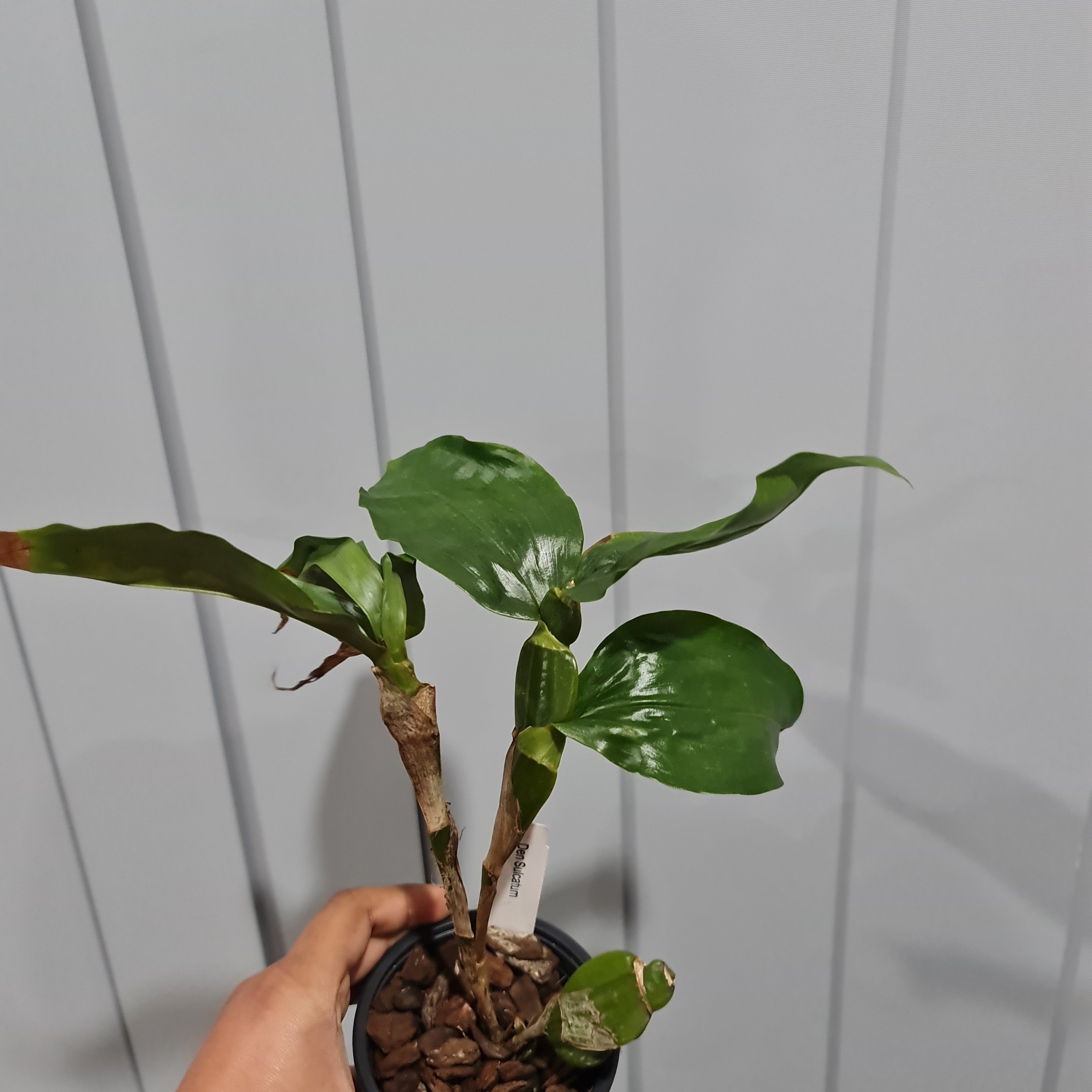 Dendrobium sulcatum is a small to medium sized, warm growing epiphyte that originates from Asia (Assam, eastern Himalayas, Myanmar, Thailand, Laos and south central China) and thrives in tropical valleys. Creamy butter yellow flowers appear in the late spring on a short, pendulous inflorescence with 1″ flowers. My favorite thing about this plant is the flat canes that can be enjoyed year round. Allow almost to dry before watering; grows well potted or mounted. Intermediate to warm temperatures and moderate light. Please refer to photo 2 and 3 for the size of plant.
