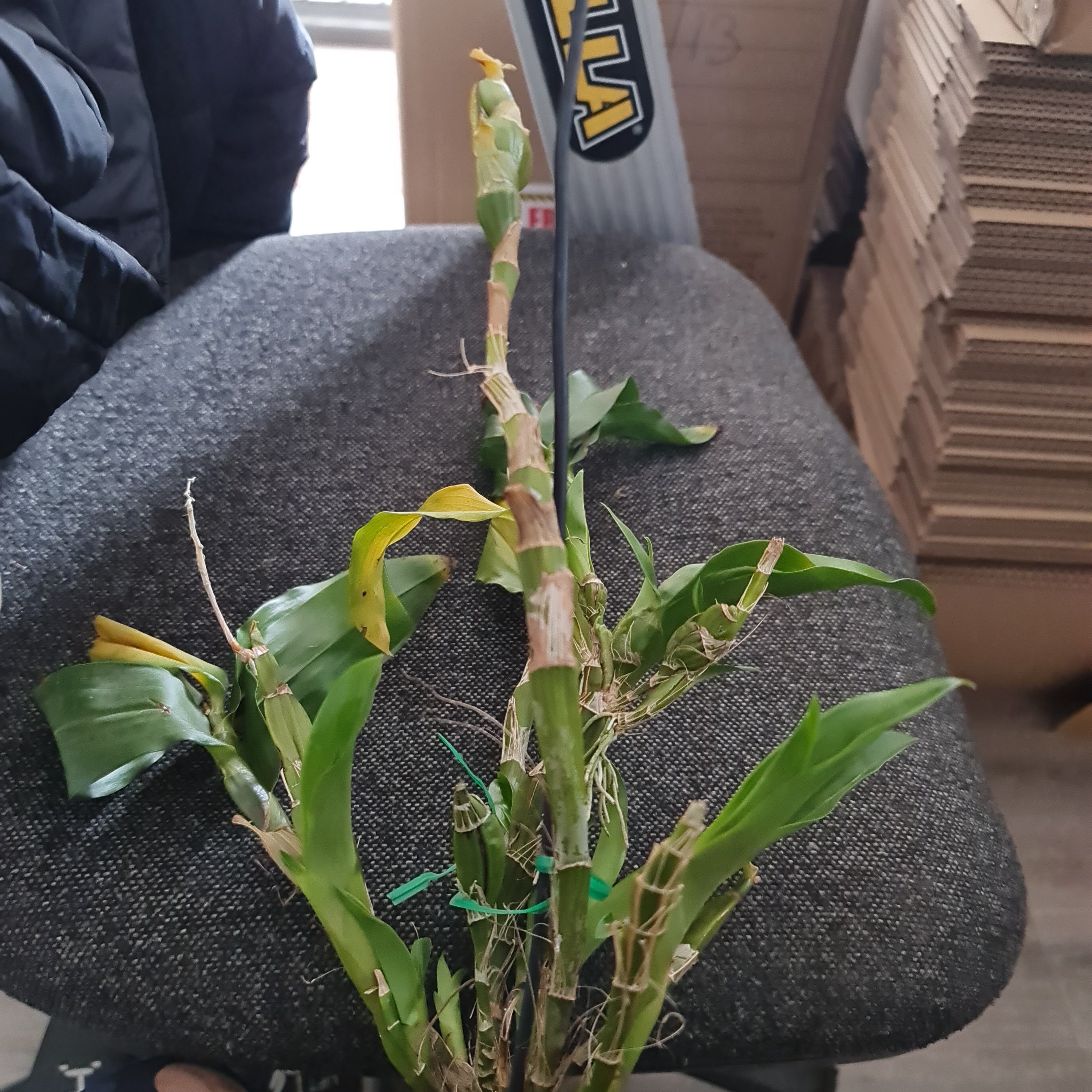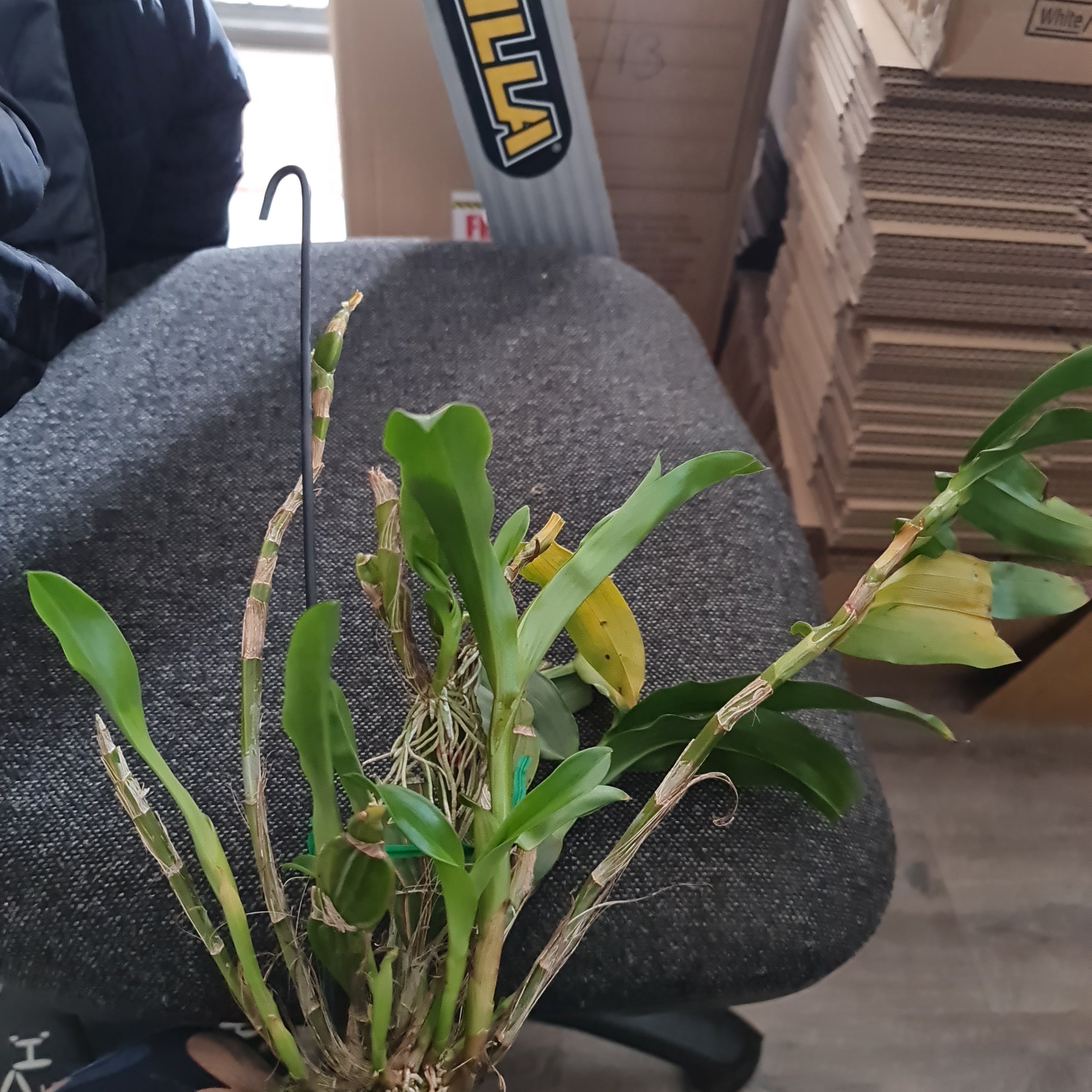 Dendrobium sulcatum is a small to medium sized, warm growing epiphyte that originates from Asia (Assam, eastern Himalayas, Myanmar, Thailand, Laos and south central China) and thrives in tropical valleys. Creamy butter yellow flowers appear in the late spring on a short, pendulous inflorescence with 1″ flowers. My favorite thing about this plant is the flat canes that can be enjoyed year round. Allow almost to dry before watering; grows well potted or mounted. Intermediate to warm temperatures and moderate light. On offer the orchid is mounted and flowering size and having keiki's on it.