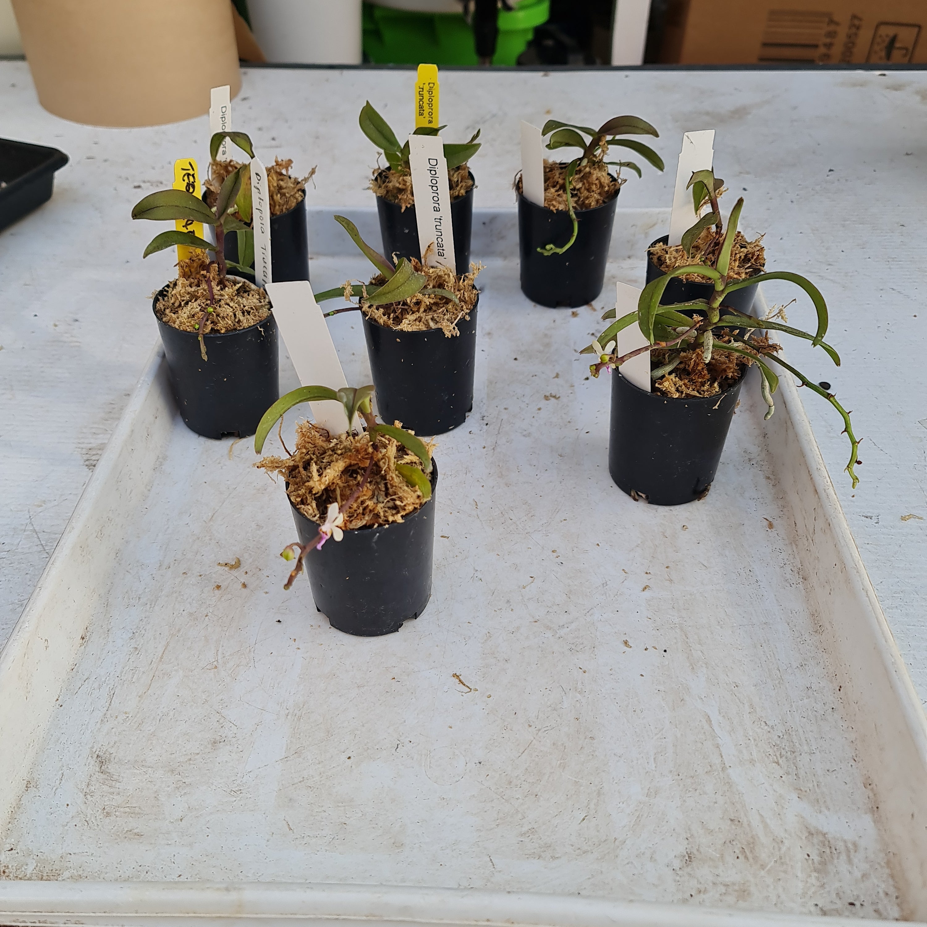 | Repotting | It is encouraged that you repot orchids only when the plant is outgrowing the pot. An orchid needs to be repotted when roots start growing outside of the pot vigorously and the pot swells or cracks. Only use a pot that is one size larger than the previous pot. Do not repot seedlings immediately upon receiving them as this can slow down growth and may cause transplant shock. When repotting, choose a pot with drainage holes so that water does not pool and cause root rot. |