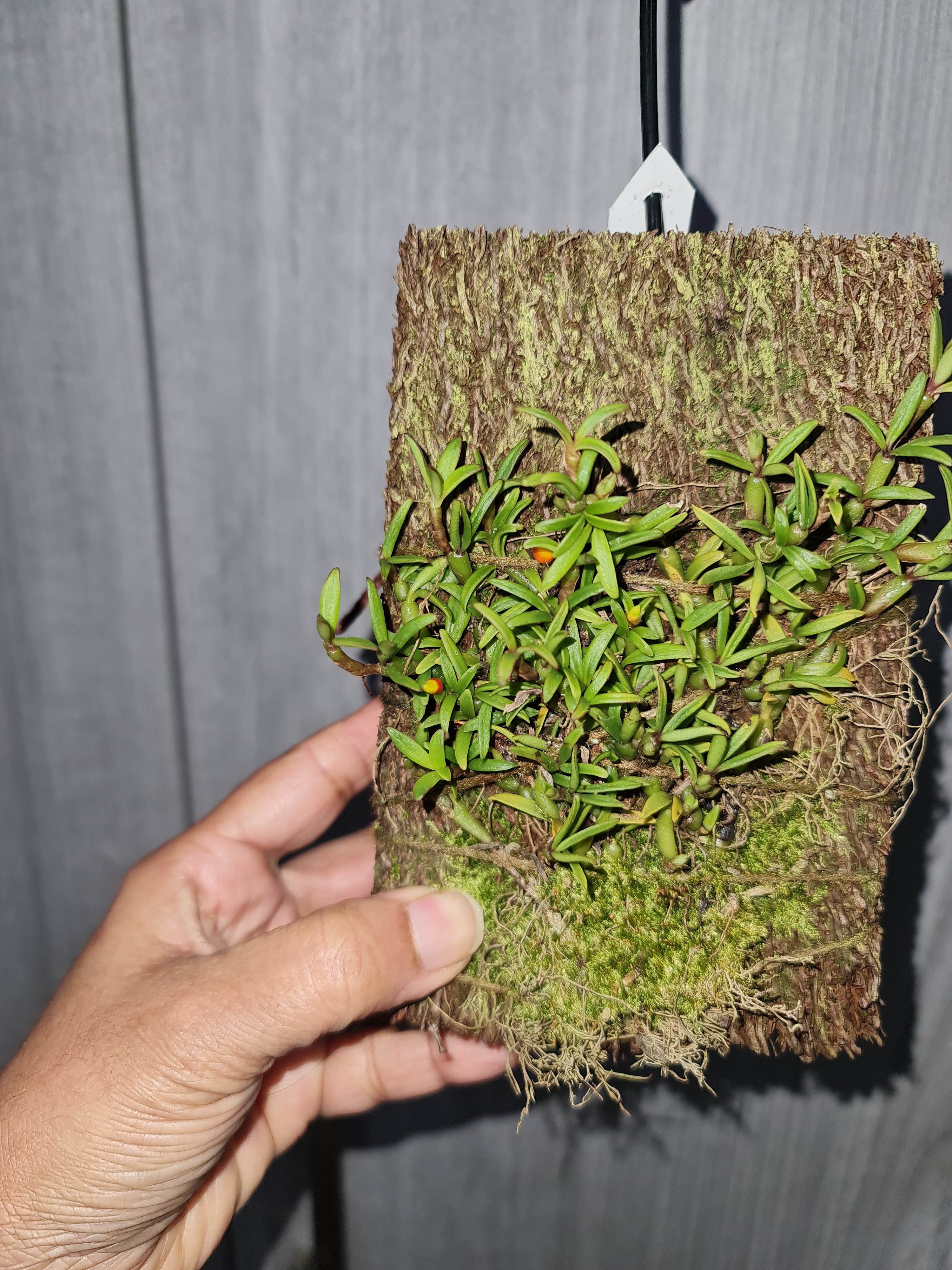 A unique species native to New Guinea growing at elevations from 3,000 to 7,000 feet above sea level. This plant likes intermediate to cooler temps but will tolerate some heat in summer. The flowers usually emerge in the spring, but we have also seen them in the fall once things cool down. These plants can be mounted, but grow well when planted in New Zealand sphagnum moss. Water as the moss approaches dryness. This plant grows rather quickly into a nice specimen. The orange and yellow flowers resemble lanterns and last for a month or two. The flowers are approximately 3/8 inch in size. Grow in shady to medium light conditions and use clean water without lots of minerals in it.