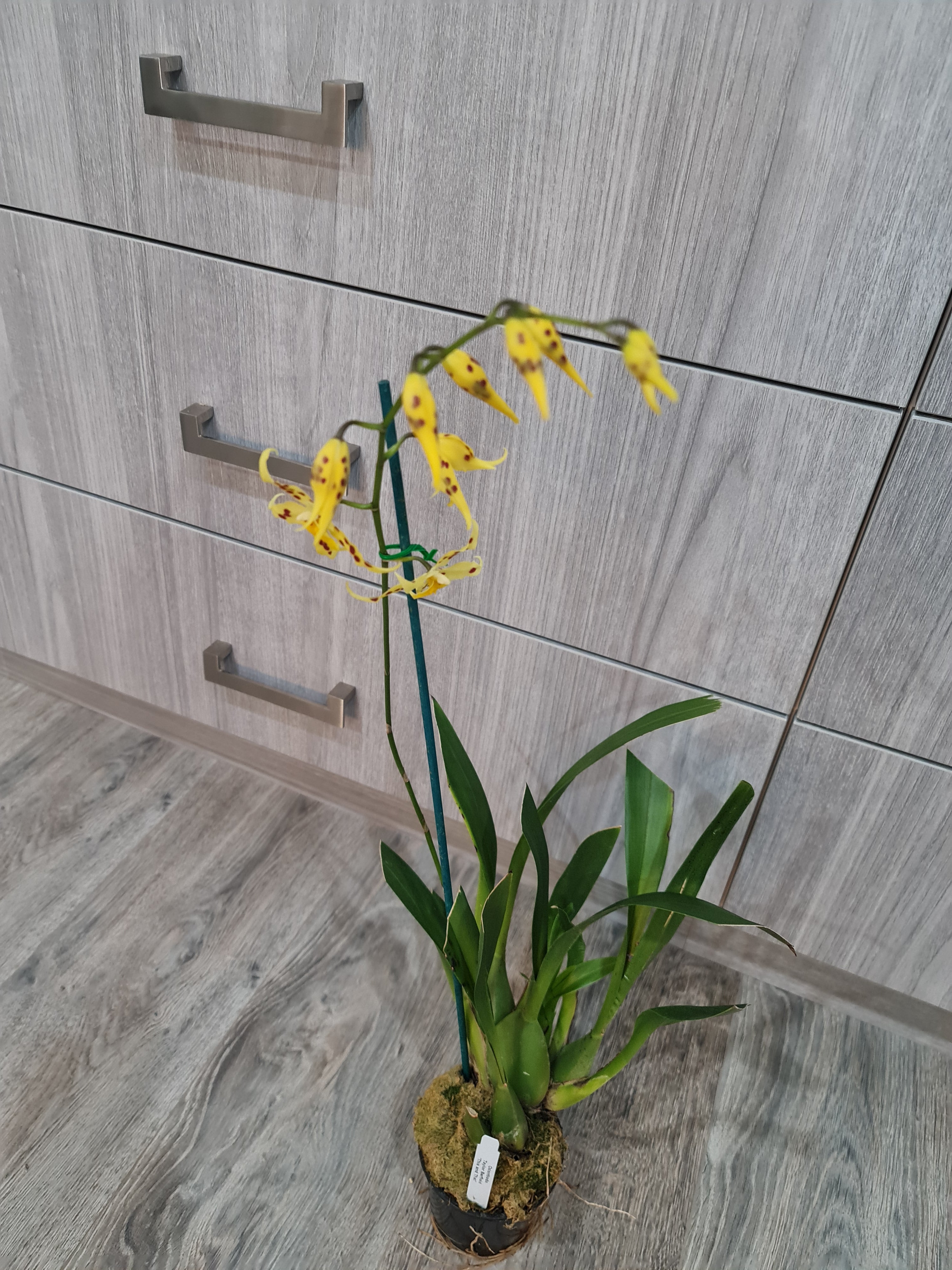 A cross between Odontoglossum cirrhosum (50%), Coichlioda noezliana, and Oncidium praestens. It blooms with sprays of many cream-yellow flowers with red spots and a bright yellow lip.