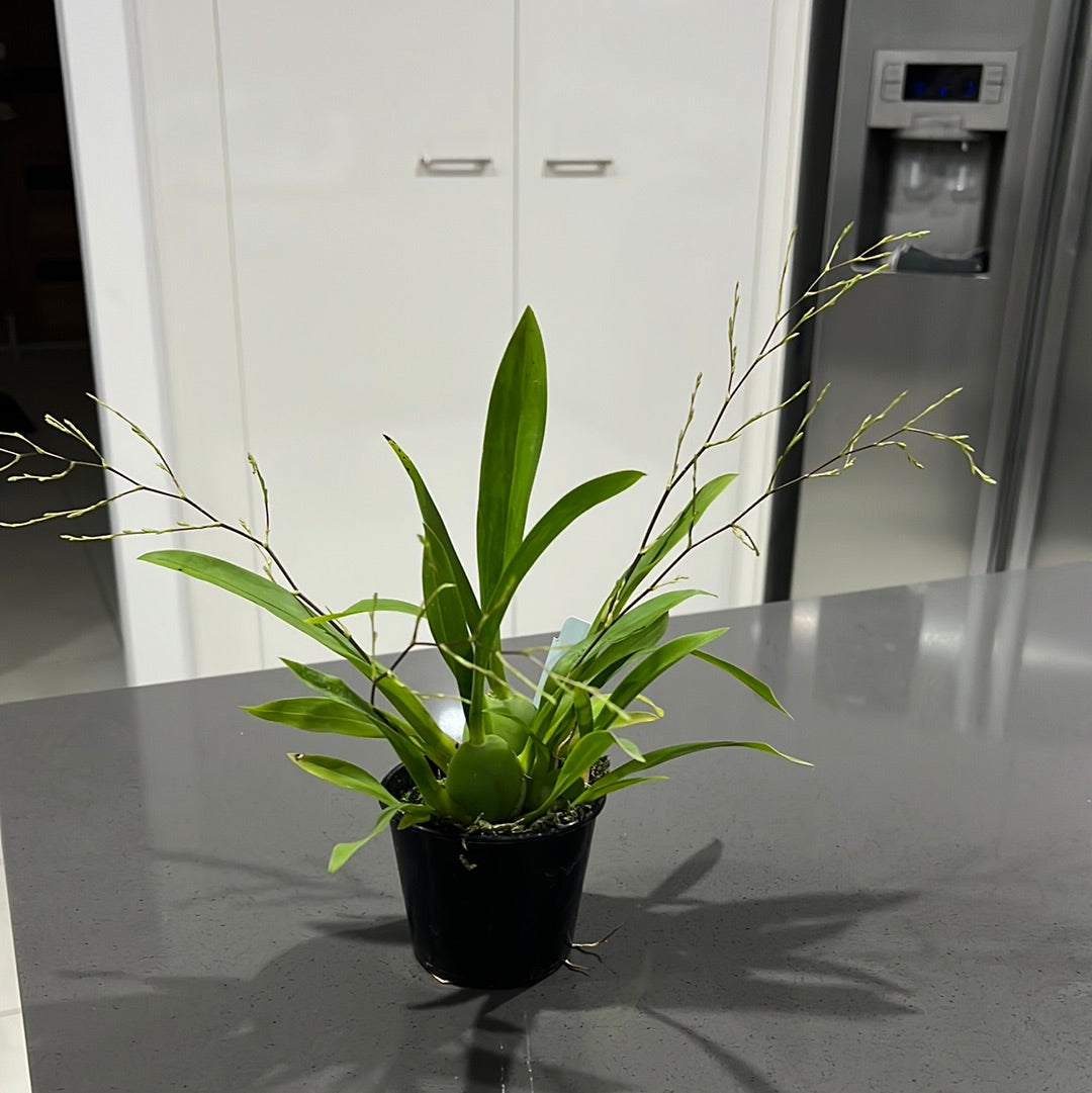 Oncidium twinkle fragrant fantasy is a miniature Oncidium that produces upto hundreds of flowers on mature plants. This particular offering produces white flowers with orange lip, fragrant blooms on mature psuedobulbs and grows vigorously. Available in spike now, will flower very soon.