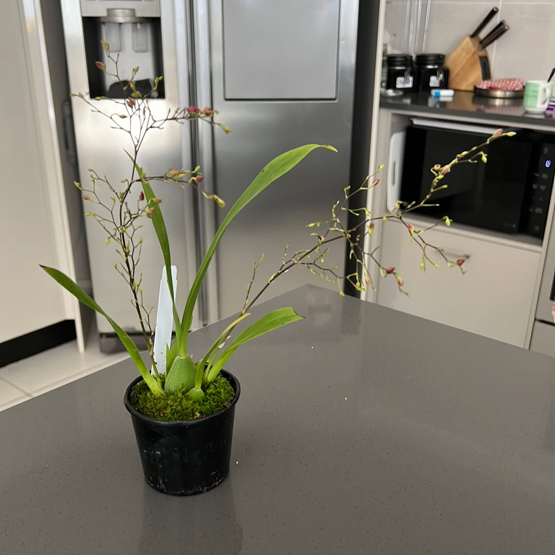 Oncidium twinkle pink is a miniature Oncidium that produces upto hundreds of flowers on mature plants. This particular offering produces dark pink, almost red, fragrant blooms on mature psuedobulbs and grows vigorously. Available in spike now, will flower very soon.