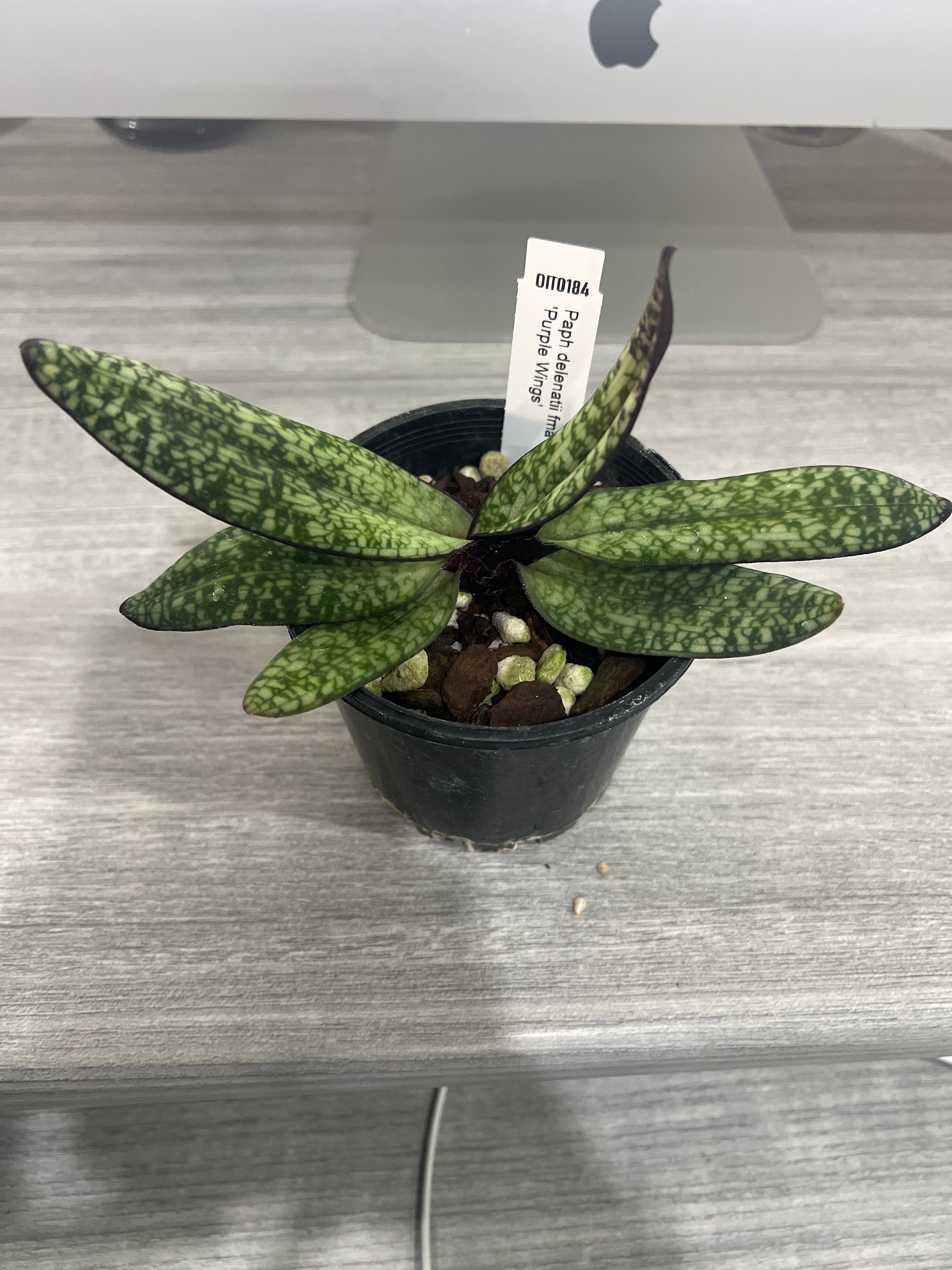 This is the darkest form of the delenatii, sometimes called 'dunkel' or 'vinicolor', known for their darker foliage and nice cherry red pouch color. Once the flowers have been open for several days, they will have a slight scent of rose. The foliage is quite beautiful, with a blackish-burgundy color under the leaves and a dark margin on the top of the leaves. Beautiful foliage plant even when not in flower! Native to Vietnam and China.
