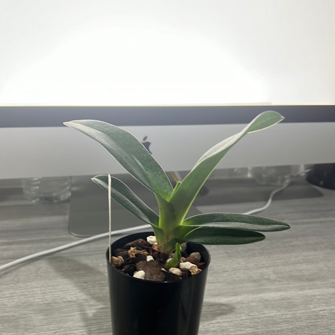 A primary hybrid which produces large, mottled foliage and typically flowers in the warmer summer months. Grows well in both bark and sphagnum moss. Grow in medium light and fertilize frequently. Do not allow the plants to dry out at the root system. Intermediate to warm temperatures work best with this variety.