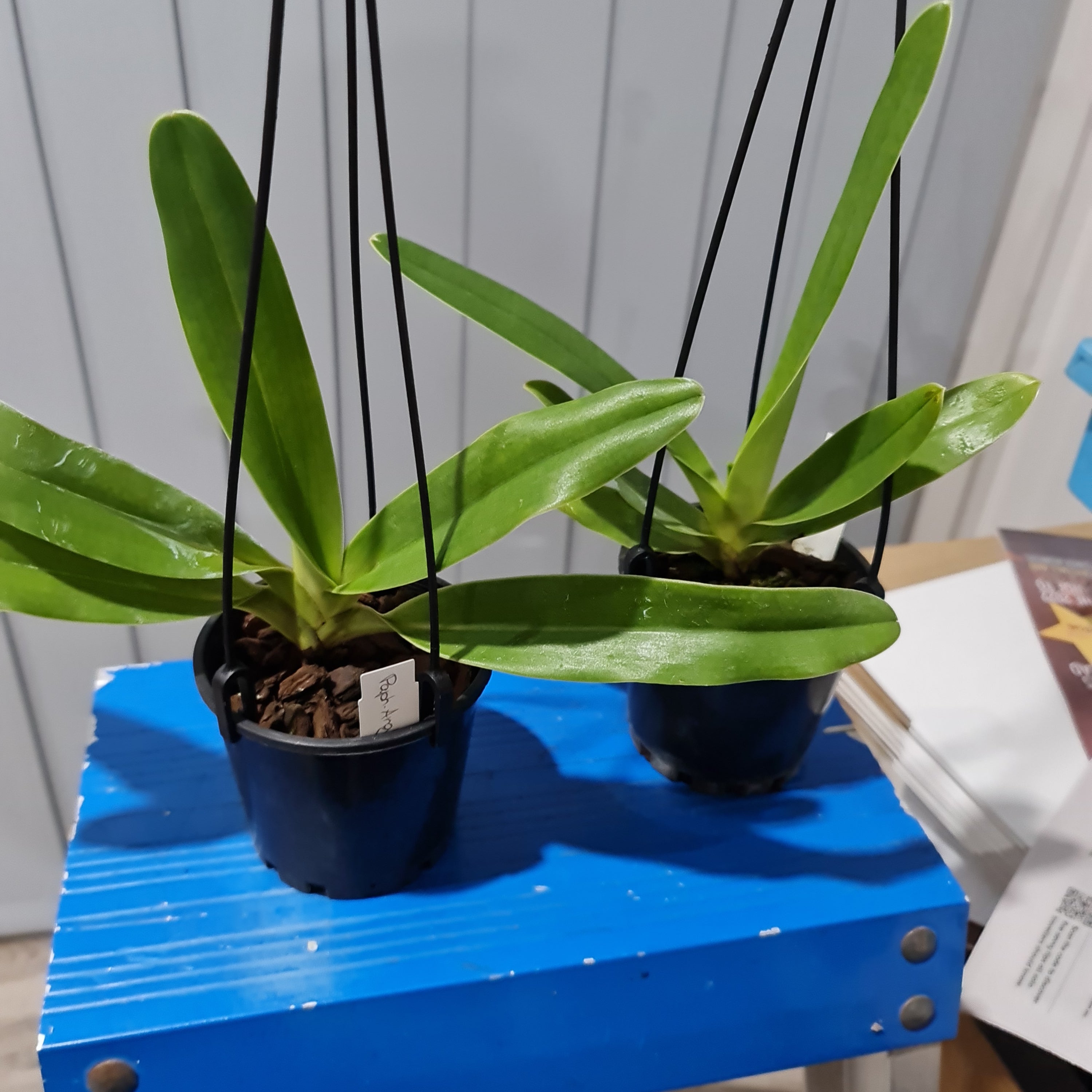 Paph. Angel Hair is a hybrid between Paph St Swithin and Paph sanderianum. With Paphiopedilum Philippinense in its heritage, Paphiopedilum Angel Hair produces multiple slippered flowers with long, twisted petals on a single spike. Enjoys brighter light than the mottled leaved paphiopedilums. This is a healthy blooming size orchid, rarely on sale.