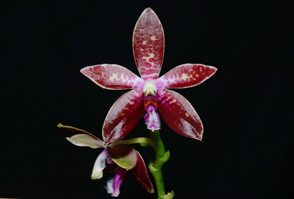 Found in Borneo at elevations of 450 to 610 meters on limestone cliffs near waterfalls on huge mossy trees 20 feet up as a small sized, hot to warm growing epiphyte with oblong to obovate leaves that blooms in the spring and summer on a shorter than the leaf, 12" [30 cm] long, zigzag, sequentially opening, few flowered inflorescence and carrying very fragrant flowers.