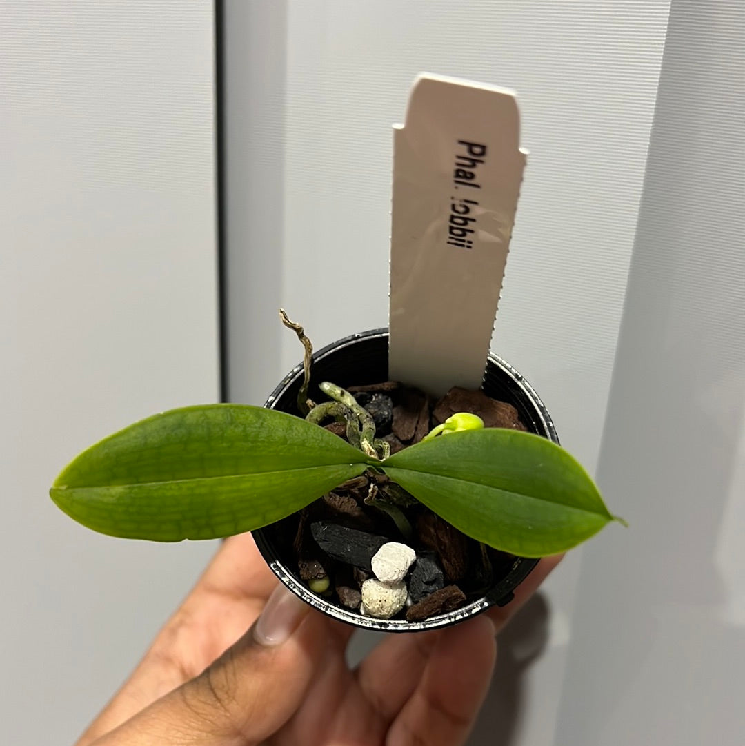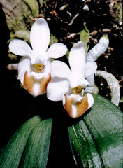 A cute miniature species native to India with small 2-3 inch leaves. The flowers are colored in white and have light chocolate lips that are hinged and move about in the wind. This is an excellent miniature that can grow well either in pots or on slabs.