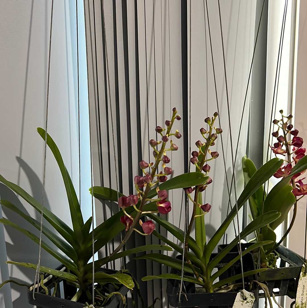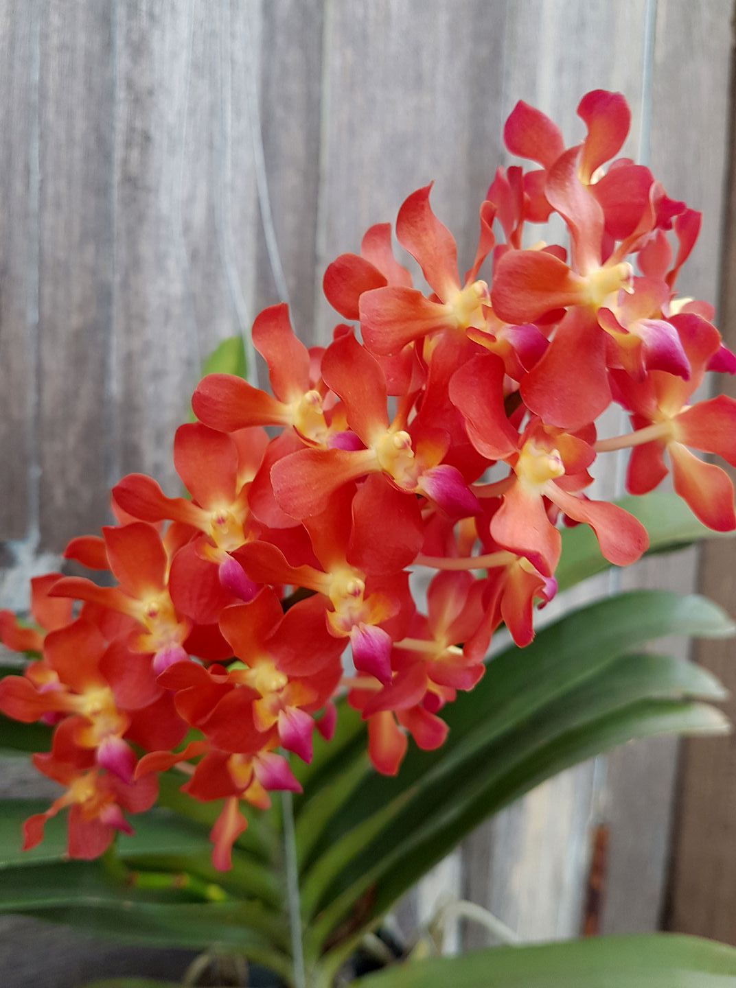 An orchid hybrid between Perreiraara Bangkok Sunset × Renanthera storiei that produces bright red flowers. This a hardy compact strap leaf Vandaceous orchid.